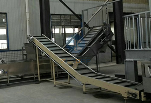 浮在水面的輕物質(zhì)經(jīng)由翻板推送到出料輸送帶,往水下沉的重物質(zhì),有槽底部的輸送帶是從另外的一端輸送提升到滾筒清洗機(jī)當(dāng)中,重物質(zhì)當(dāng)中的小顆粒雜質(zhì)是會(huì)從滾筒清洗機(jī)當(dāng)中的滾筒當(dāng)中漏下,往水下沉,沉到水選清洗一體機(jī)的底部輸送帶上面,經(jīng)由輸送帶從另外的一端輸送出去,清洗之后的物料經(jīng)由清洗機(jī)本身所帶的提升機(jī)到抗壓分離機(jī)當(dāng)中來(lái)進(jìn)行榨汁。